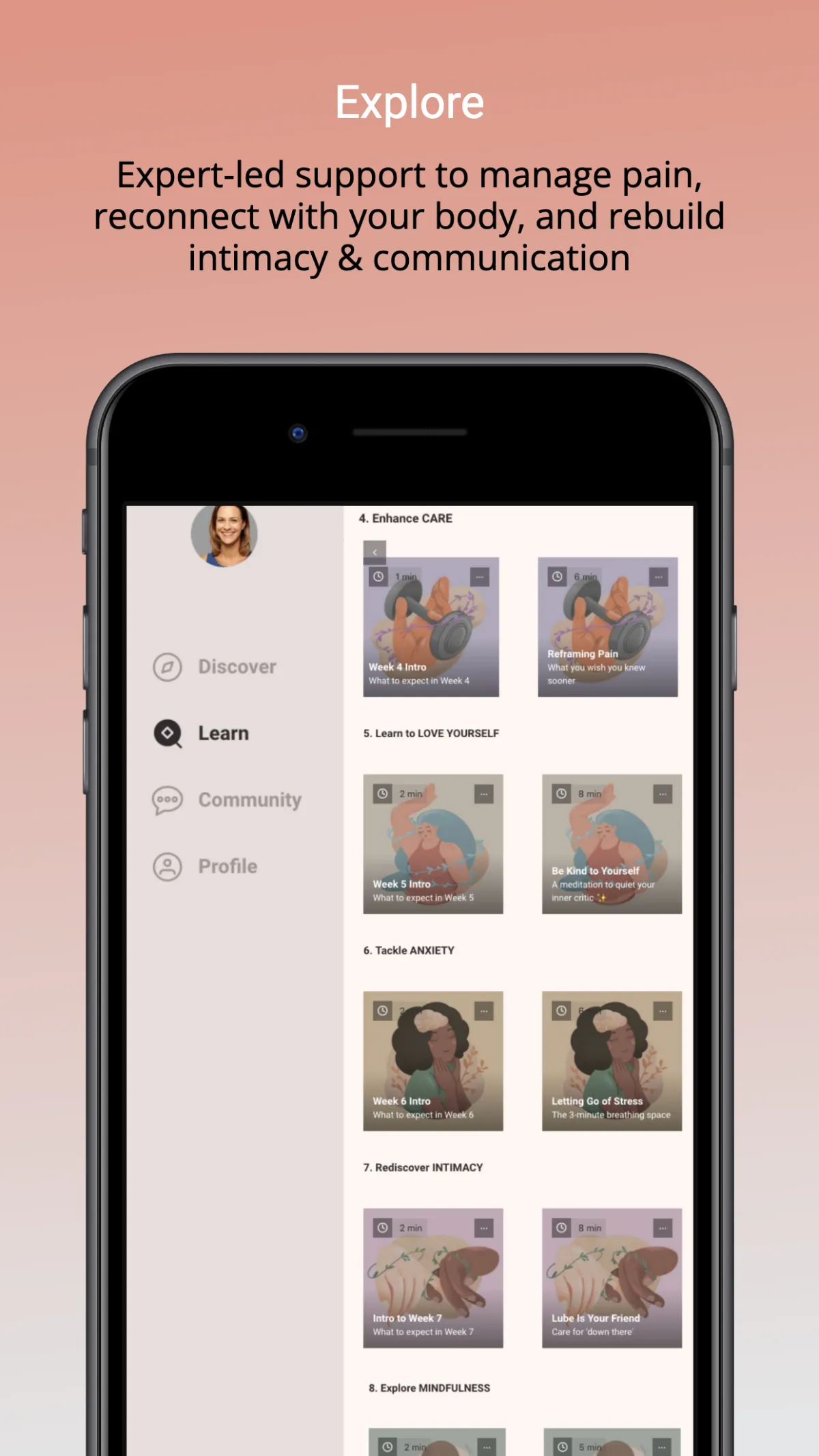 50+ expert-led videos and audio practices from physiotherapists, psychologists, sexologists, occupational therapists, and trauma-informed coaches.