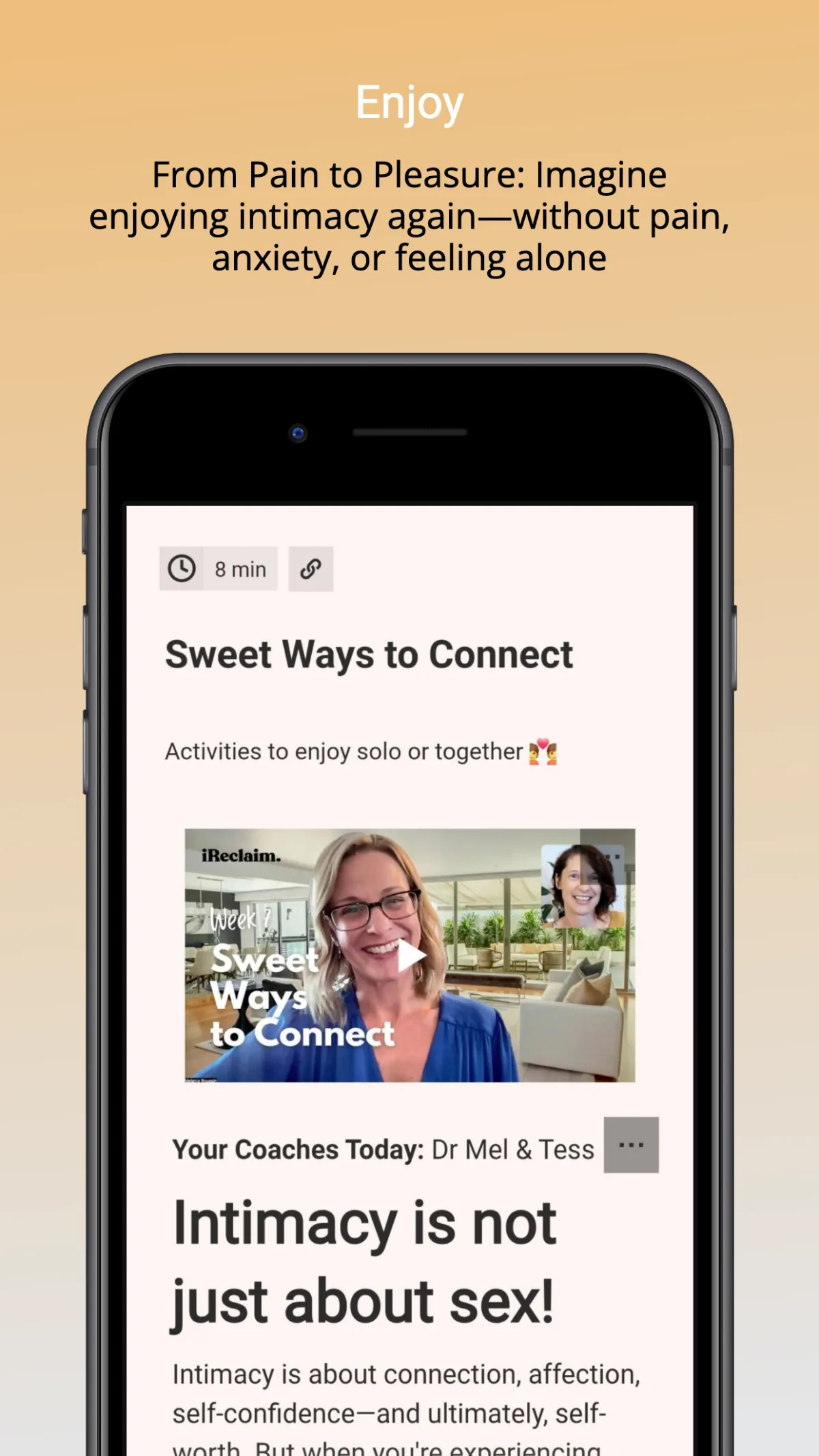 Has sex become stressful or painful? The iReclaim App is your pocket guide to feeling comfortable in your body, reconnecting with your partner, and enjoying intimacy—without pain, stress, or fatigue standing in the way of pleasure and connection.